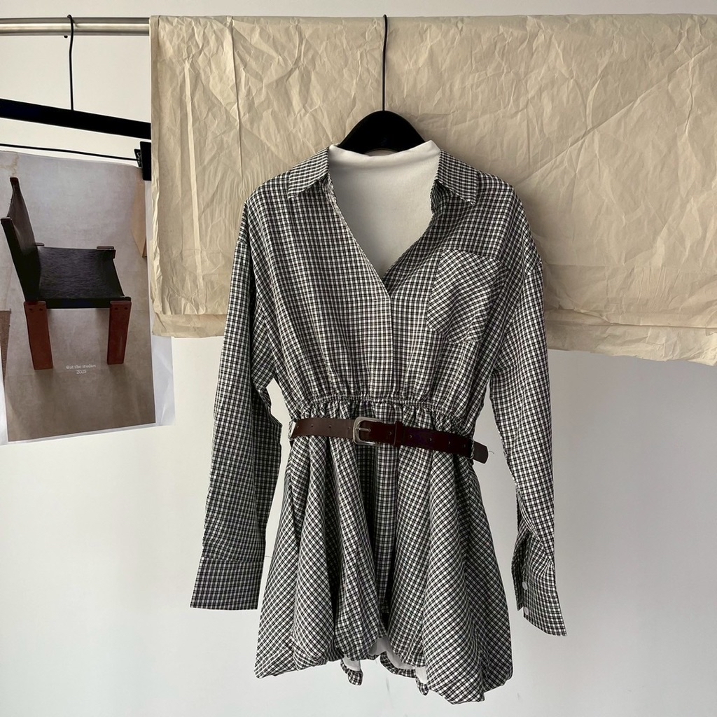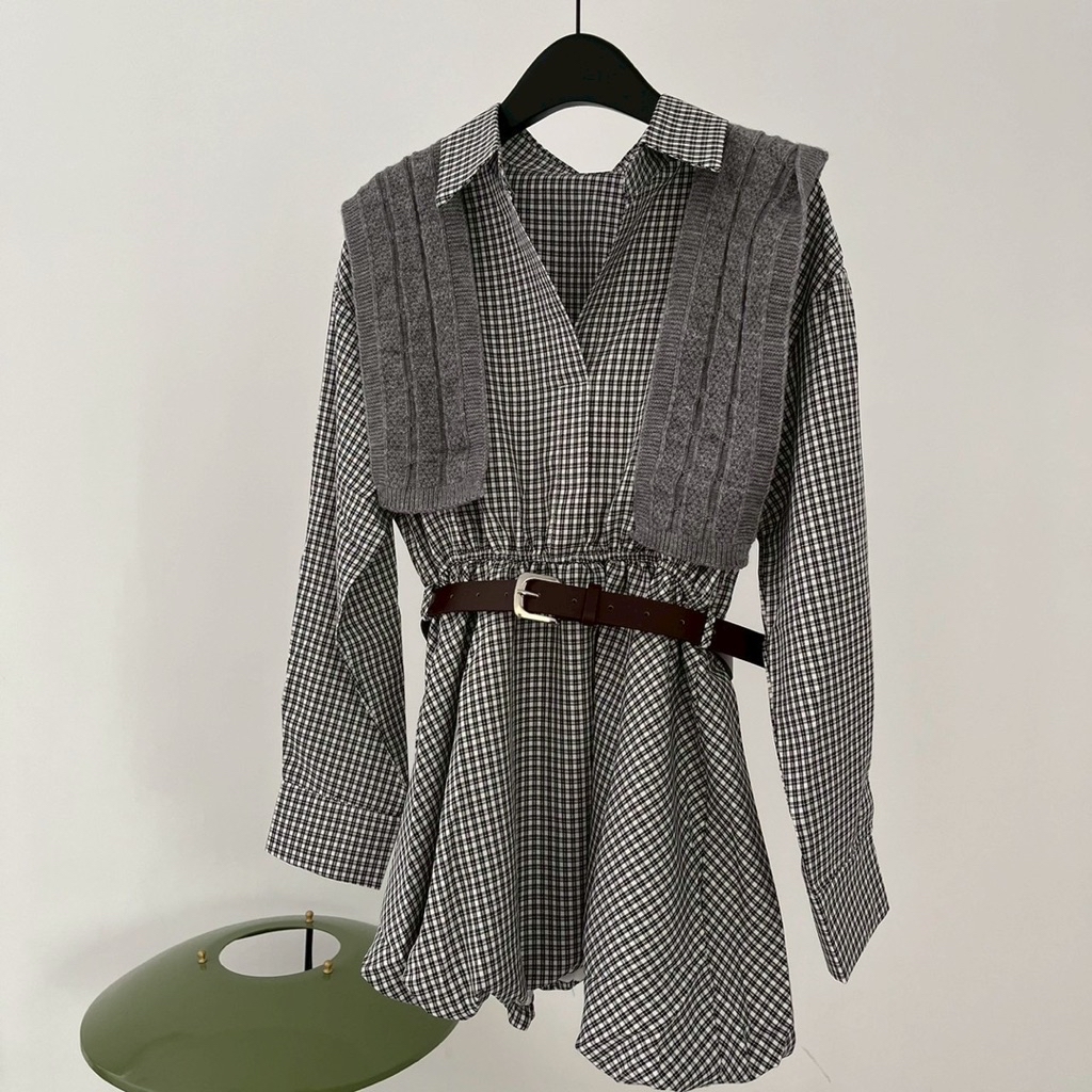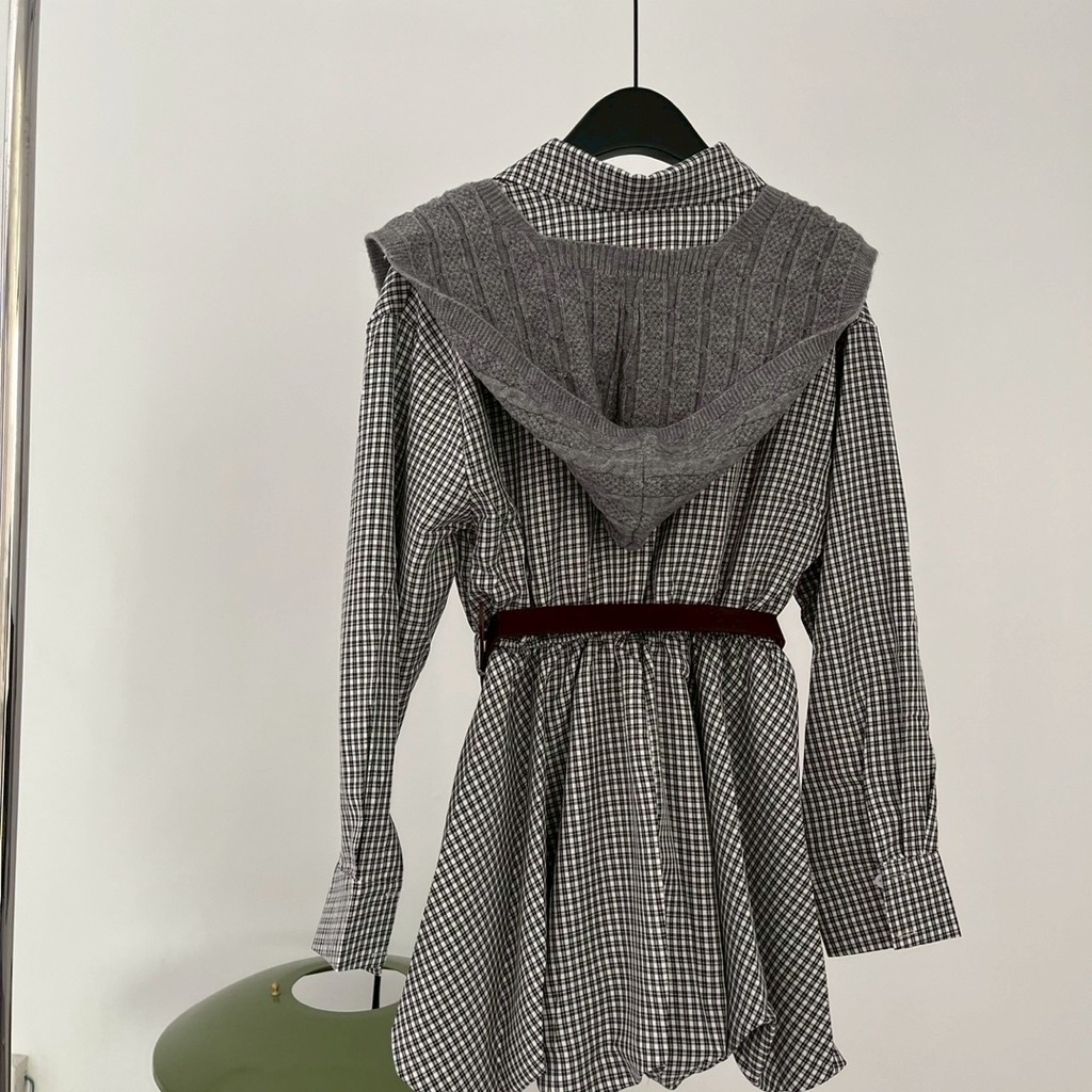 New | 翻領格紋花苞洋+連帽披肩 三件式套裝組 附皮帶-F